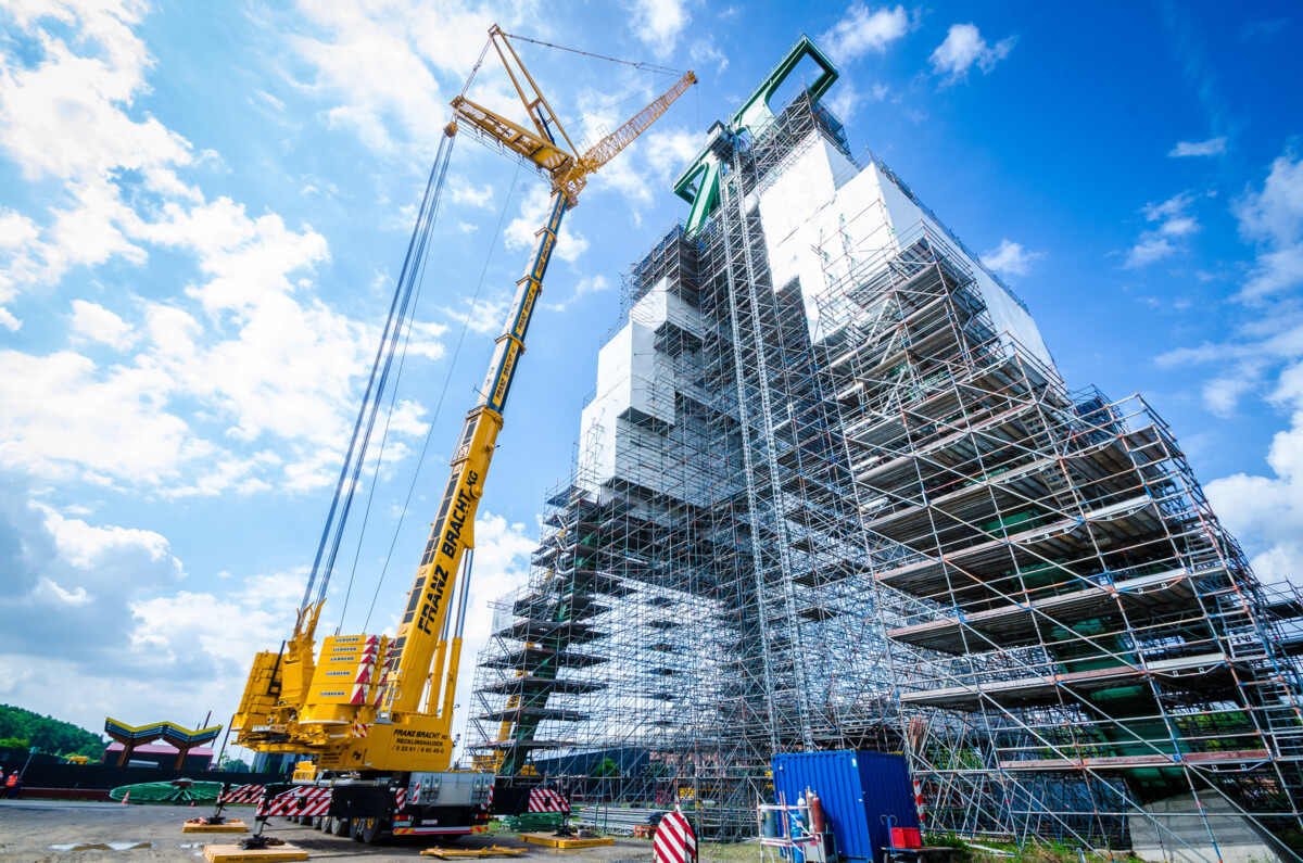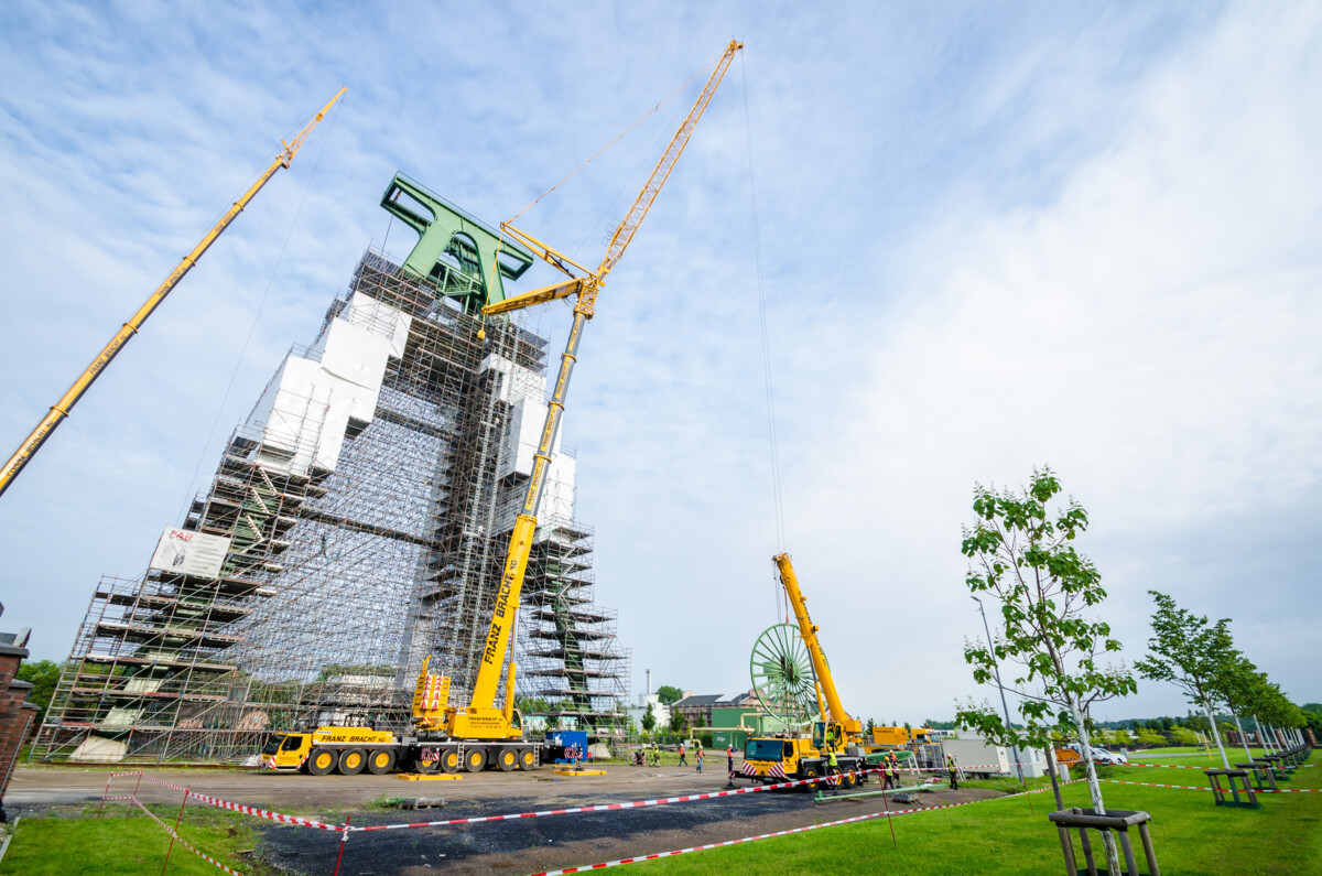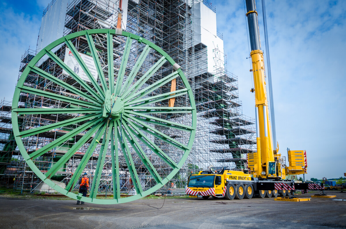 Am 2.8. begann der Aufbau unseres Krans an der Zeche Lohberg in Dinslaken. Der Kran wurde mit 94 t Ballast, 42,5 m Hauptausleger plus 4 m Televerlängerung, 52,5 m Wippe und einer Hakenhöhe von 96m aufgebaut. Vier Seilscheiben sollten hier nach Demontage und Aufbereitung wieder in das Wahrzeichen eingesetzt werden. Beginnend am 3.8., wurde pro Tag eine der bis zu 15t schweren Seilscheiben eingesetzt.