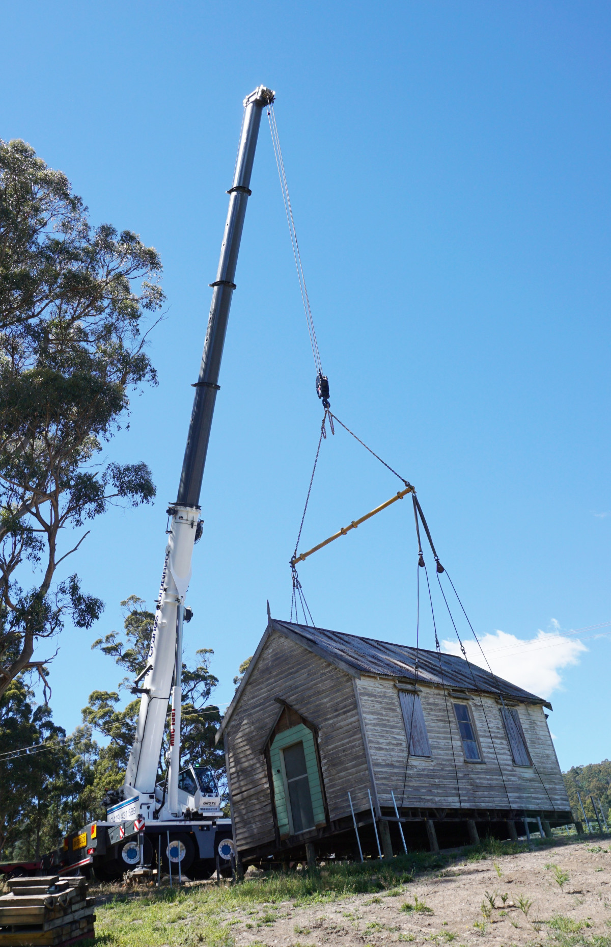 Cranes Combined wählt GMK5150L für die heikle Anhebung der Kirche, die zuvor über 100 Jahre am vorherigen Standort im Einsatz war. Die reibungslose Funktion der Kransteuerung gewährleistet einen unfallfreien Hubvorgang. Das australische Kranverleihunternehmen Cranes Combined stellte einen Grove GMK5150L All-Terrain-Kran zur Verfügung, um eine Kirche im Bundesstaat Tasmanien zu versetzen. Ausgestattet mit 5,6 Tonnen Gegengewicht und einem Arbeitsradius von knapp 12 Metern benötigte der Kran etwa sieben Stunden, um die 6 Tonnen schwere Kirche zu bewegen, die dort über 100 Jahre gestanden hatte. „Die Kirche wurde im 19. Jahrhundert erbaut und ist daher trotz ihrer Größe relativ empfindlich“, sagte Chris Kolodziej, Mitinhaber von Cranes Combined zusammen mit seiner Frau Cathy. „Der GMK5150L läuft sehr ruhig, sodass der gesamte Hubvorgang reibungslos verlief. Selbst die Fenster, die sehr dünn und zerbrechlich sind, wurden beim Transport nicht beschädigt.“ Der GMK5150L hat eine maximale Tragfähigkeit von 150 t. Er verfügt über eine Hauptauslegerlänge von bis zu 60 m und eine maximale Auslegerhöhe von 88 m.