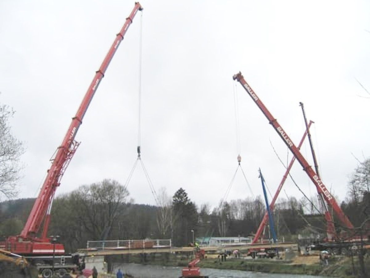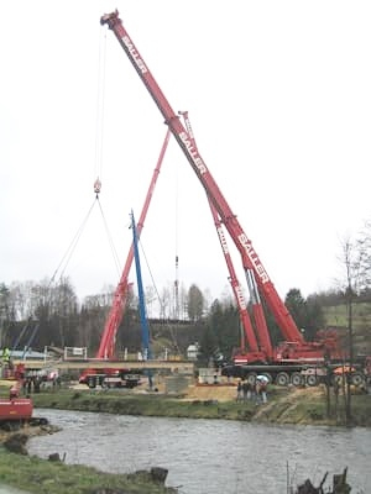 In Regen - Zwiesel waren insgesamt 4 Krane im Einsatz, um für eine Brücke Montagehilfe zu leisten . Die Holz- konstruktion mit einem Gewicht von ca. 50 to wurde jeweils hälftig und zeitgleich von den Flussufern eingehoben. Unter den Kranen waren der LTM 1300, LTM 1200/1, LTM 1045/1, LTM 1040/1.