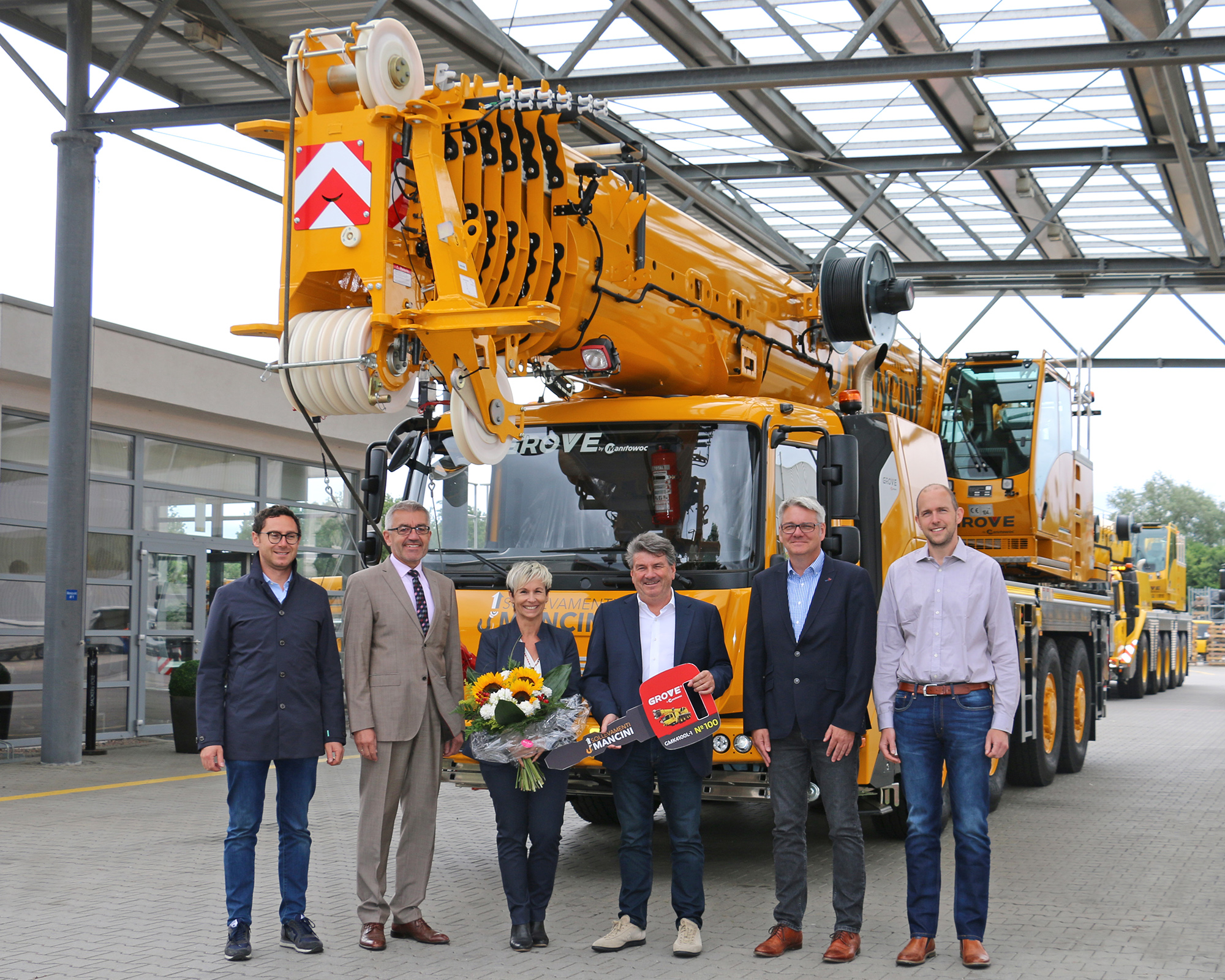 Manitowoc hat seinen 100. Grove GMK4100L-1 All-Terrain-Kran verkauft Der äußerst beliebte vierachsige Kran wurde erst im dritten Quartal 2016 auf den Markt gebracht. Der italienische Kunde Sollevamenti Mancini nahm den Kran im Rahmen einer Zeremonie im Manitowoc-Werk in Wilhelmshaven, Deutschland, entgegen.---------------------- Manitowoc hat seinen 100. Grove GMK4100L-1 All-Terrain-Kran ausgeliefert, obwohl dieser erst im dritten Quartal 2016 auf den Markt kam. Der legendäre Kran wurde an Sollevamenti Mancini verkauft, ein familiengeführtes Vermietungsunternehmen mit Sitz in der Toskana, Italien. Die Firmeninhaber Fiorenzo Mancini und seine Frau Simona Rossetti nahmen am 12. Juni im Rahmen einer feierlichen Übergabezeremonie im Manitowoc-Werk in Wilhelmshaven den GMK4100L-1 in Empfang. Die Zeremonie wurde von Manitowoc-Verkaufsleiter Davide Camperi geleitet und im Anschluss fand eine Werksbesichtigung statt.---------------------------- Fiorenzo Mancini erläuterte die Gründe für die Anschaffung des GMK4100L-1 durch Sollevamenti Mancini: „Wir haben uns aufgrund seiner kompakten Abmessungen, seiner hohen Leistung und seiner überlegenen Kraft für den GMK4100L-1 entschieden. Die geringe Trägerbreite bietet große Vorteile beim Befahren der Straßen in unserer Region, und der kompakte Heckschwenkradius ermöglicht maximale Kapazität auf engen Baustellen. Kurz gesagt: Der GMK4100L-1 erfüllte all unsere Anforderungen.“ Das Unternehmen Sollevamenti Mancini wurde 1963 von Fiorenzos Vater gegründet und ist heute in der Toskana fest etabliert. Mit seiner Flotte von Mobilkränen und Hubarbeitsbühnen bietet es allgemeine Mietdienstleistungen, die Montage von Betonfertigteilen und Arbeiten in Innenräumen an.----------------------- Der perfekte Partner Der GMK4100L-1 mit 100 t Tragfähigkeit gehört zur Langausleger-Serie der All-Terrain-Krane von Grove. Er wurde 2016 nach dem Erfolg des GMK4100L, den er ersetzte, auf den Markt gebracht------------------------ „Der Kran bietet einzigartige Innovationen und erstklassige Fähigkeiten im Bereich der straßentauglichen Krane“, sagt Andreas Cremer, globaler Produktleiter für Geländekrane bei Manitowoc. „Er zeichnet sich zudem durch die besten Traglasttabellen seiner Klasse aus und ist dank seiner kompakten Bauweise auch auf engstem Raum leicht zugänglich und manövrierbar.“---------------------------------- Der GMK4100L-1 ist mit einer Breite von nur 2,55 m und einer Länge von 13,42 m (einschließlich Hilfshubwerk) zwar kompakt, bietet aber dank seiner Tragfähigkeit von 100 t und des 60 m langen Megaform-Auslegers die nötige Kraft und Reichweite für Lasten, die sonst nur von größeren Kranen ausgeführt werden. Die maximale Auslegerhöhe beträgt 89 m, und dank des Einzelmotors kann der Kran bis zu 6,7 t Gegengewicht innerhalb der zulässigen Achslastgrenze von 12 t transportieren. Der Kran ist außerdem mit dem Kransteuerungssystem (CCS) von Manitowoc ausgestattet. CCS ermöglicht die Integration der MAXbase-Technologie von Manitowoc zur variablen Abstützpositionierung des GMK4100L-1. „Wir sind überzeugt, dass dieser Kran sowohl in Europa als auch darüber hinaus weiterhin erfolgreich sein wird. Wir freuen uns auf den nächsten Meilenstein“, so Cremer abschließend.